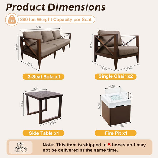 MBY Outdoor Aluminum Patio Furniture Set, Patio Conversation Sofa Set with 37,000 BTU Fire Pit Table w/Glass Wind Guard, All Weather for Pool, Balcony, Garden-Brown or White