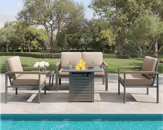 MBY 5-Piece Modern Patio Furniture Set with Fire Pit Table, Metal Outdoor Sectional with Cushions & Wood-Like Armrests, Cozy Conversation Set for Porch, Balcony, Garden, Yard